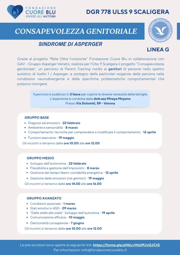 Una delle attività appartenenti alla linea d’intervento G, coordinata e realizzata da Fondazione Cuore Blu in collaborazione con GAV – Gruppo Asperger Veneto è la “Consapevolezza genitoriale”, un percorso di Parent Training rivolto ai genitori di persone nello spettro autistico di livello 1 / Asperger, a sostegno delle particolari esigenze della persona nella condizione neurodivergente e delle specifiche problematiche comportamentali che possono insorgere.